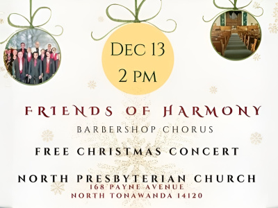 Basic event infoEvent date: Dec 13 2025 - 2:00pm to 3:30pmLocation: North Presbyterian Church 168 Payne Avenue 14120 North Tonawanda , NY United States See map: Google Maps New York US Public event fieldsPublic attachments: 2025-12-13 Sat. 2 PM FOH at North Presbyterian Church - North Tonawanda 8.5 x 11 Poster.docx