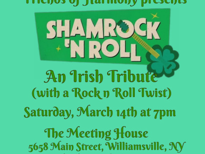 Basic event infoEvent date: Mar 14 2026 - 7:00pm to 8:30pmLocation: The Meeting House 5658 Main St 14221 Williamsville , NY United States See map: Google Maps New York US Public event fieldsEnjoy a musical tribute to the Irish with a Rock 'n Roll twist all in four part barbershop style a capella harmony. Stayed tuned for more details soon.